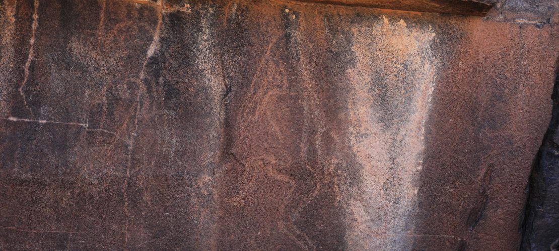 The mural is from Tanshal – Acacus, showing an elephant with strange physical characteristics and features. This is because the shaman is in an altered state of consciousness and sees animals in forms and appearances different from reality. The figure directly in front of the elephant is the shaman leading the elephant forward into the arid lands where rain is desired to fall. There are two figures to the right and left of the elephant carrying bows, which are symbols of rain power and control. On the right, we notice a fissure in the wall with threads of water painted around it. Although there are no deposits near the fissure, these cracks are the place for summoning rain spirits and their entry and exit into our world. Near the fissure, there are dots similar to those present at the far left of the mural.
