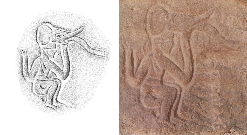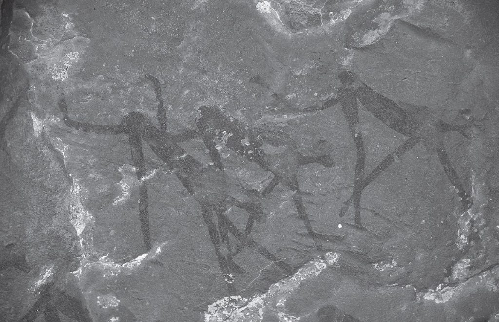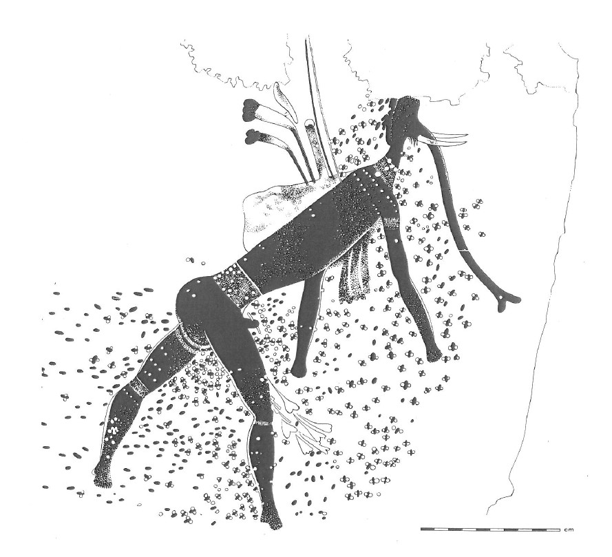 We must point out here that the state of erection seen frequently in the mural refers to power and the trance state. There are two female figures to the right and left of the mural. There is a relationship between women and rain (Ikhwa), and they are called during rituals “wives of the rain.” Undoubtedly, the panel is shamanic and presents the elephant as one of the important rain animals in the Acacus, also referring to the trance dance and the state of obtaining supernatural power. The prehistoric rain religion provided the same solutions to the same problems, foremost among them drought, throughout all of Africa.