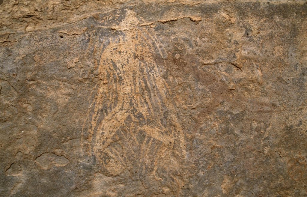 I have never seen any mural that depicts rain as a man except in Wadi Intaharin in the Acacus. In (Figure 1), rain is embodied as a man, confirming the Bushmen’s words that rain has legs which are the feet of the rain, and ribs which are the dense, dark clouds. The man’s head is open, with raindrops and streams falling from it. His hands reach the ground vertically and densely, and his feet are open on the ground for the water to reach them. At the same time, his head is the water hole that the shaman directly behind him wants to reach. The shaman’s movement indicates he is on his journey to the house of water and that he emerged from the hole symbolized by his open foot in the center, forming the water hole.