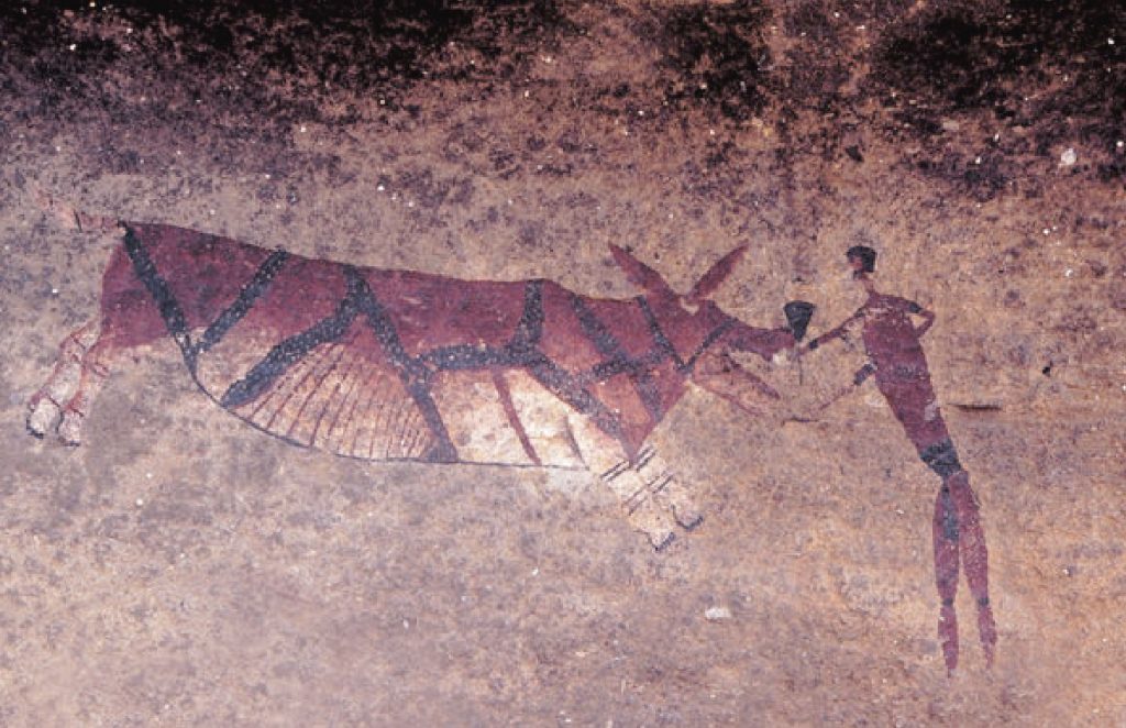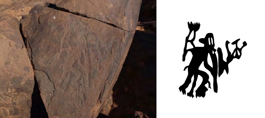 Wadi al-Baqar (Valley of the Cow) is located in the Fezzan Basin in southern Libya, at the intersection of longitude 12.848928°E and latitude 27.597147°N. In this valley, there are unique shamanic engravings on open-air rocks. The shamanic perspective and the theme of rain-making dominate the murals of this valley. In (Figure 1), we see a figure wearing an elephant mask in the context of performing shamanic trance rituals[^1].