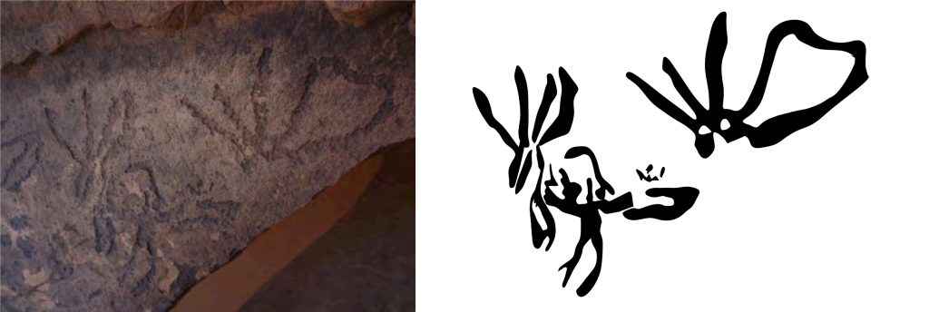 In another mural (Figure 4) from Wadi al-Baqar, Loai Abdulhamid describes it as “scenes of birds, flowers, and palm trees.” However, what is seen ascending to the sky are none other than the threads of light depicted in rock art in this manner, as in (Figure 5).