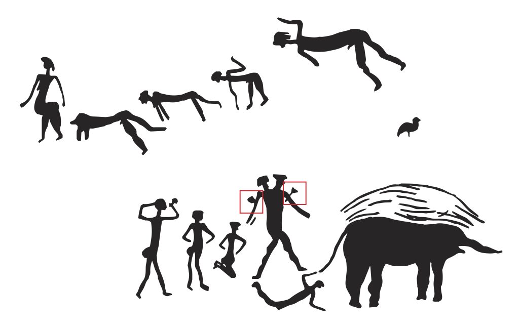“A rock painting of a shamanic dance. In the center, two or more figures are dancing, holding what appears to be a rope studded with white dots. To the right, another figure holds the rope above their head. This rope represents the spiritual threads of light that the shaman climbs while ascending to the sky to bring rain.”