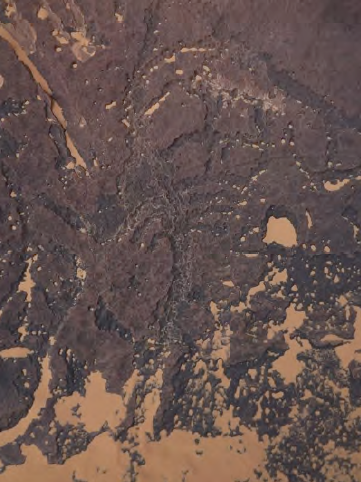 Behind this figure’s back, there is a plant resembling flowers, raised upwards. This plant is called “butcho” ; it appears in rain-making rituals and the extraction of the rain animal from the water hole, and is traditionally used as a tranquilizer during trance rituals. In (Figure 2), we see the same plant on the arms of the man attempting to calm the rain animal. In (Figure 3), we find a figure extending their hand with the buchu plant to calm the rain bull while it is being pulled from the water hole. To the left of the image, there is another figure wearing a mask, but it is incomplete due to poor definition. This indicates that this figure was dancing during the performance of trance rituals, and that they are about to bring the rain animal, which in truth represents the water within the water hole. Rain rituals cover most rock art sites in Libya, but these rituals, in the absence of the shamanic perspective, have been neglected due to the complexity of their interpretation. Contributing to this neglect was the failure to use ethnography as a tool for interpretation; the focus was often on formal structure, neglecting the identity of the mural itself and the context in which it could be discussed. Wadi al-Baqar has been completely neglected, only coming to light through the photographs of Loai Abdulhamid, a PhD candidate in philosophy.